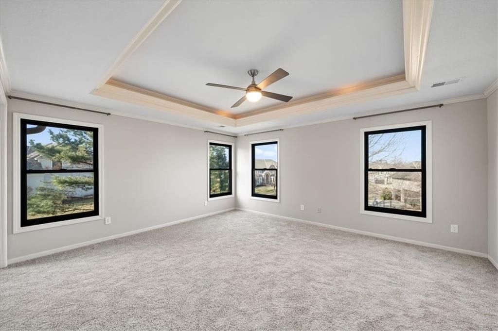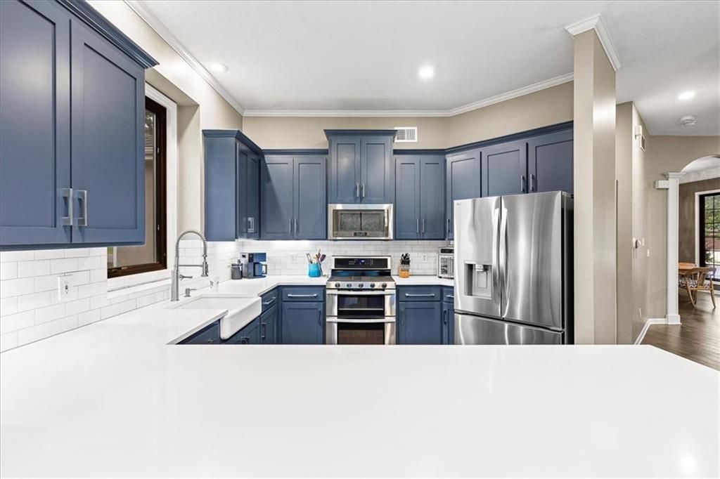 PRICE IMPROVEMENT + BRAND NEW CARPETING - Exceptional Value in Lionsgate! Now refreshed and thoughtfully repositioned, this beautifully updated Overland Park traditional offers nearly 3,900 square feet of finished living space at a compelling price point. From the moment you arrive, new designer garage doors and manicured landscaping create strong curb appeal. Inside, Renewal by Andersen aluminum-clad windows (approx. $40K investment) fill the home with natural light while enhancing efficiency and comfort. The remodeled primary suite delivers a true retreat with a spa-inspired bath featuring a modern freestanding soaking tub and custom tile shower. The gourmet kitchen blends style and function with stainless steel appliances, solid surface countertops, farmhouse sink, tile surround, and sleek soft-close cabinetry - ideal for both everyday living and entertaining. The finished lower level expands your options with a 5th non-conforming bedroom and full bath, media room, custom built-ins, stylish bar area, walk-in wine room, abundant storage, and even a secret kids' hideaway. Situated on a fully fenced corner lot with lush landscaping and a charming patio, this home offers space, flexibility, and long-term value in one of Overland Park's most sought-after school districts. Recently refreshed with brand new carpeting and competitively priced, this Blue Valley opportunity deserves a fresh look. Schedule your private showing and experience the value firsthand. MOTIVATED SELLER!
