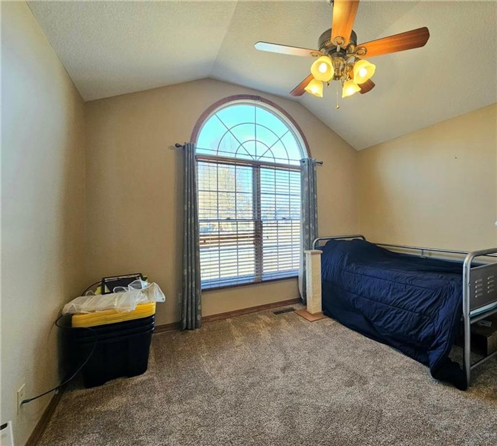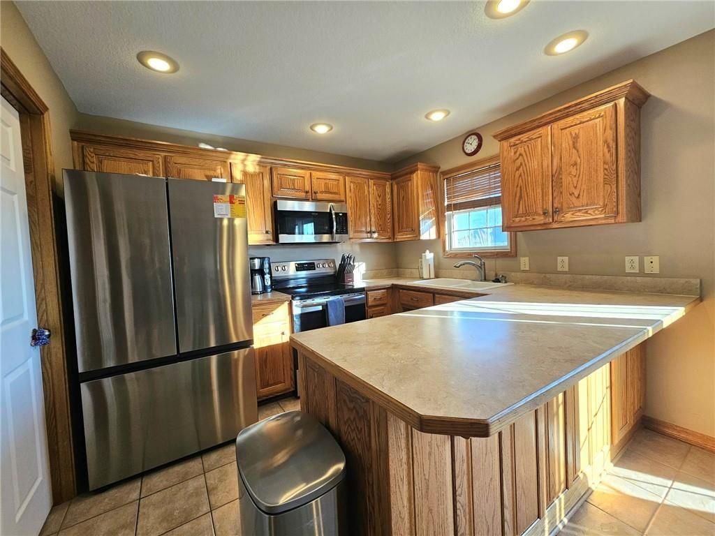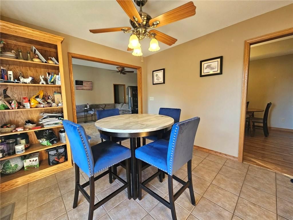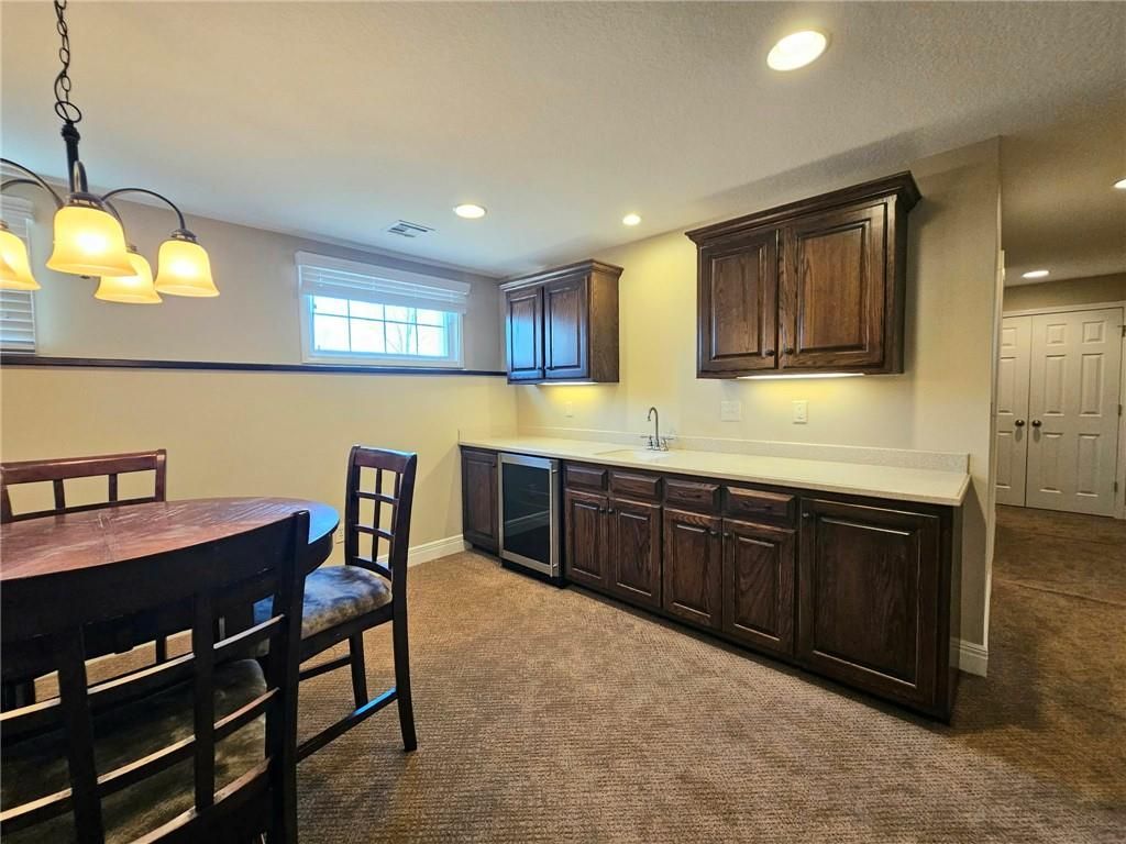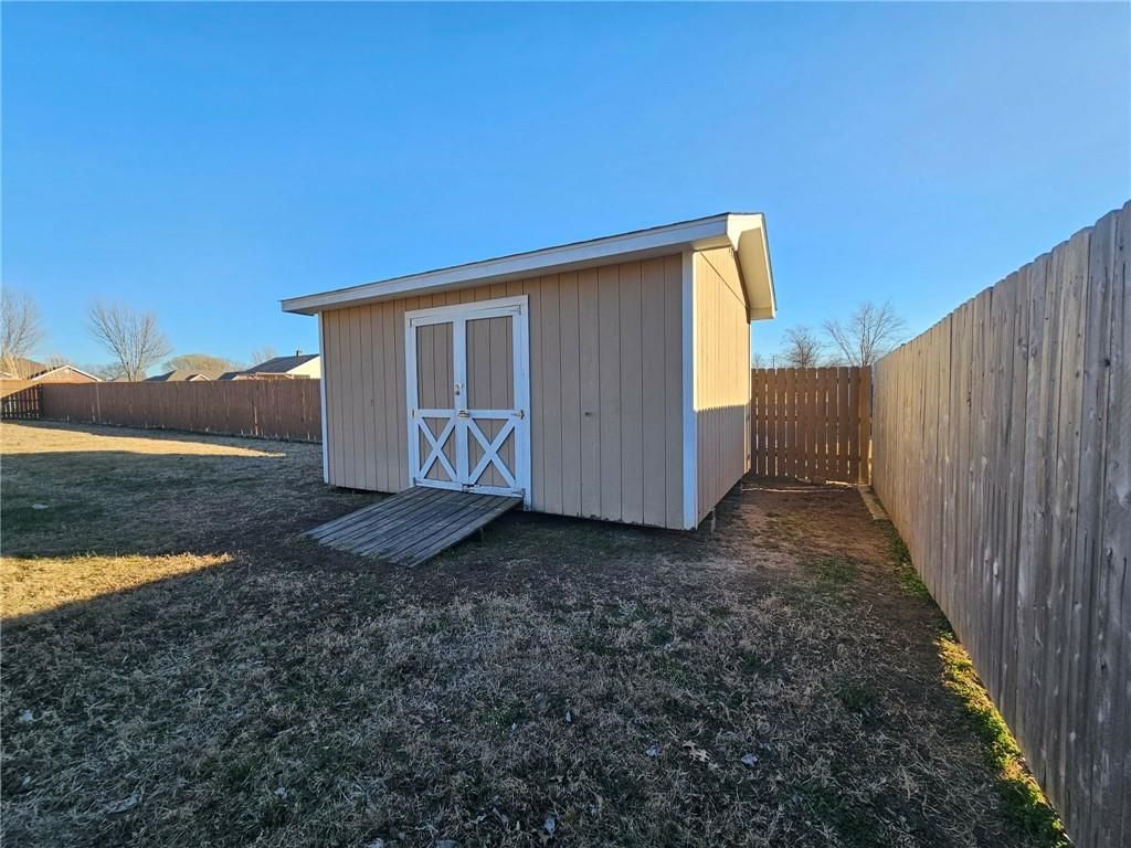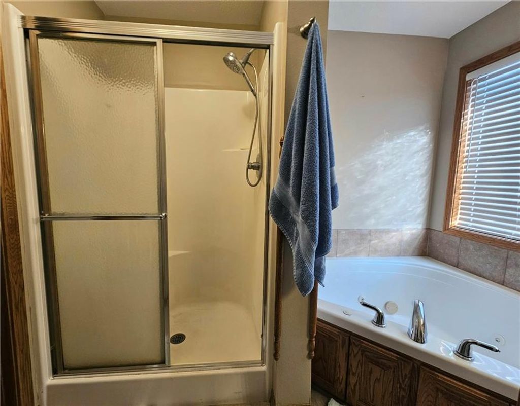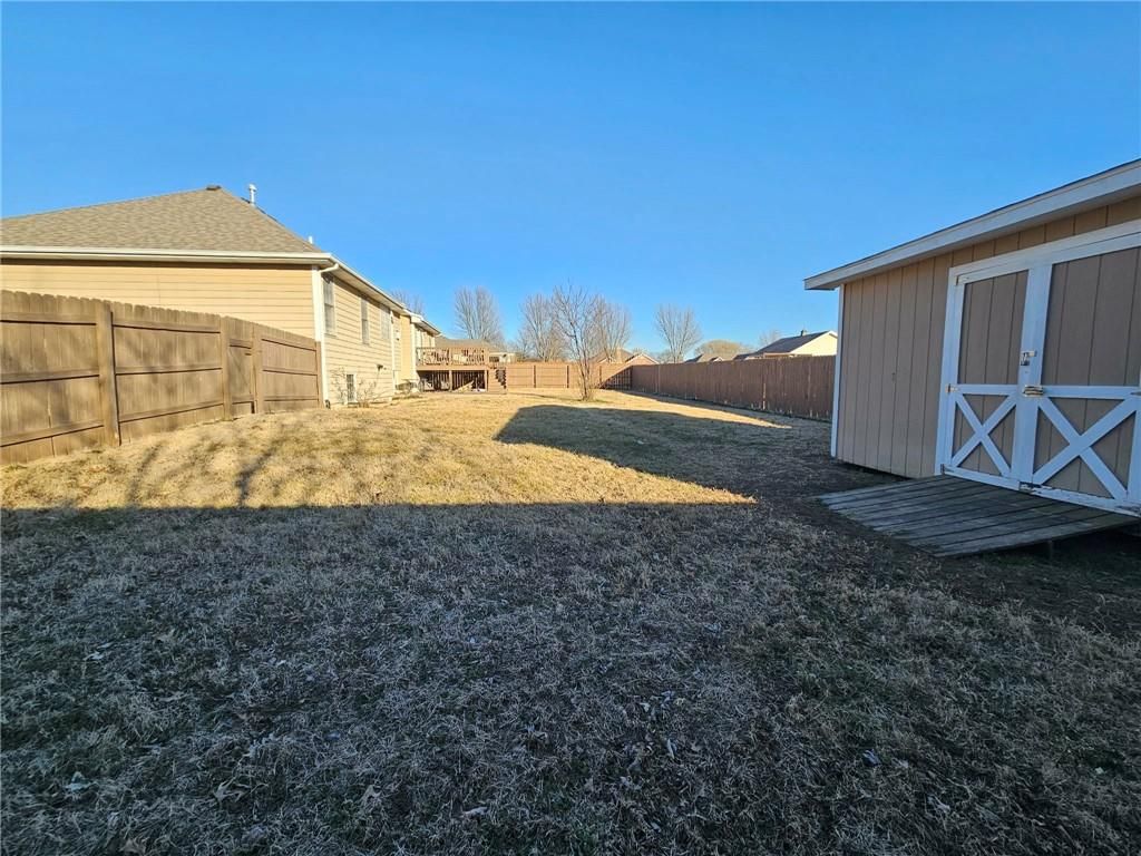 Wonderfully cared for five-bedroom, three-bath ranch home with a full basement featuring egress windows and a dedicated storm room. This home offers a variety of thoughtful storage solutions and architecturally interesting details throughout. The main level includes a tiled entryway, an expansive living room with a gas log fireplace, a formal dining room with wood-look flooring, and a tiled country kitchen with custom cabinetry and a breakfast nook. The breakfast nook features custom-built-in shelving and a sliding door leading to the deck. A laundry room with additional storage is located just off the kitchen and provides convenient access to the attached garage. The primary suite offers a tray ceiling, a walk-in closet, a jetted tub, and a separate oversized shower with seating. Two additional main-level bedrooms are generously sized, with one featuring an arched window and a vaulted ceiling. The basement is an entertainer's dream, featuring egress windows, two bedrooms, each with a walk-in closet, a family room with another gas log fireplace flanked by built-ins, an adjacent recreation room with a wet bar, and a convenient bathroom. Unfinished basement spaces include mechanical systems, including a radon mitigation system with a warranty, a new water heater, PEX plumbing, additional storage, and a storm room to provide peace of mind. The backyard retreat features a wooden privacy fence, a deck accessible from the breakfast nook, a patio, and a prefabricated storage shed. Whether entertaining or quietly relaxing, this space offers something for everyone. The exterior features low-maintenance cement siding and brick masonry. The French drain system features convenient and efficient pop-up emitters. Conveniently located near many of Pittsburg's most sought-after amenities. Schedule your private showing today.