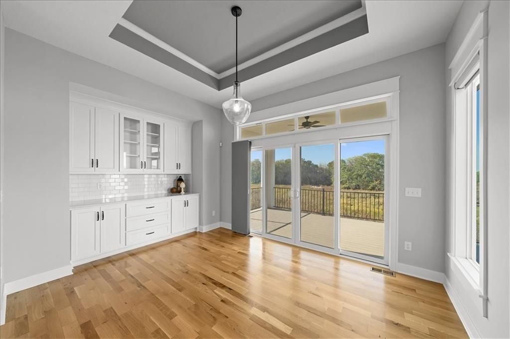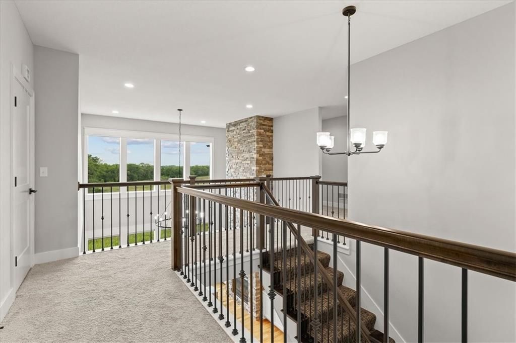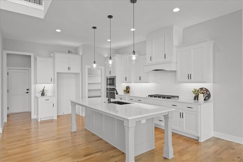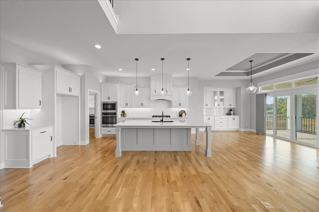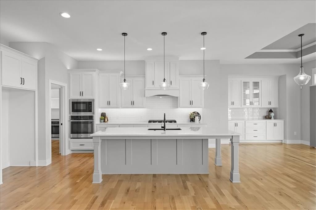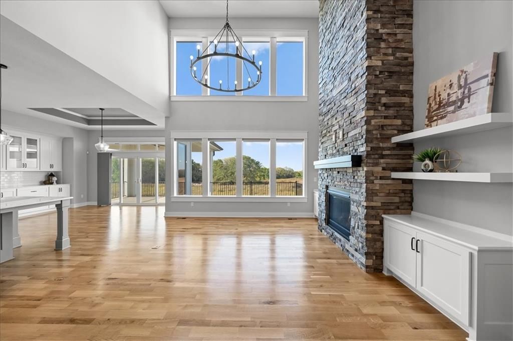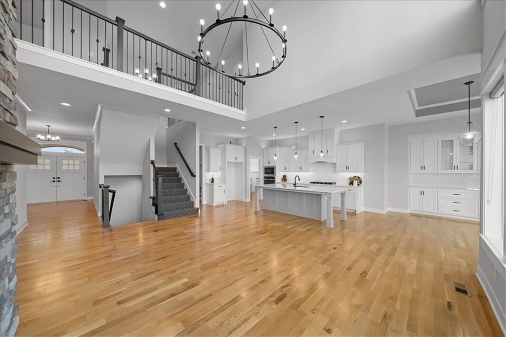 Prepare to be blown away by this incredible home and price in the heart of the award-winning Blue Valley School District. This gorgeous 1.5-story home is priced nearly 200K below county appraisal, offering one of the best values in all of Johnson County for size, condition, and location. Step inside to soaring ceilings, a dramatic two-story stone fireplace, and wide-plank hardwood floors that make an immediate statement. The chef's kitchen is a true standout - complete with an upgraded gas cooktop, custom cabinetry, a massive walk-in pantry with a second oven, and all the space you need for effortless entertaining. The main-level primary suite delivers luxury and convenience with tons of natural light, a spa-inspired bath, and dedicated laundry hookups connected to the huge walk-in closet. Upstairs, every secondary bedroom features its own walk-in closet and private bath, plus a second laundry area. The finished walkout lower level adds even more value with a spacious rec room, wet bar, guest suite with ensuite bath, and an additional half bath. Outdoors, enjoy serene sunsets from the expansive partially covered deck. Neighborhood amenities elevate the lifestyle - resort-style pool, clubhouse, fishing pond, and walking paths - ALL within minutes of top-rated schools, premier shopping, dining, and highway access. Homes like this simply don't come along at this price. Quick closing available - act now to secure one of the best buys in Blue Valley!