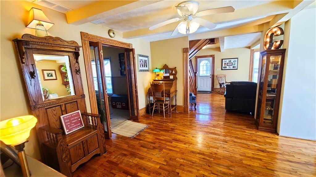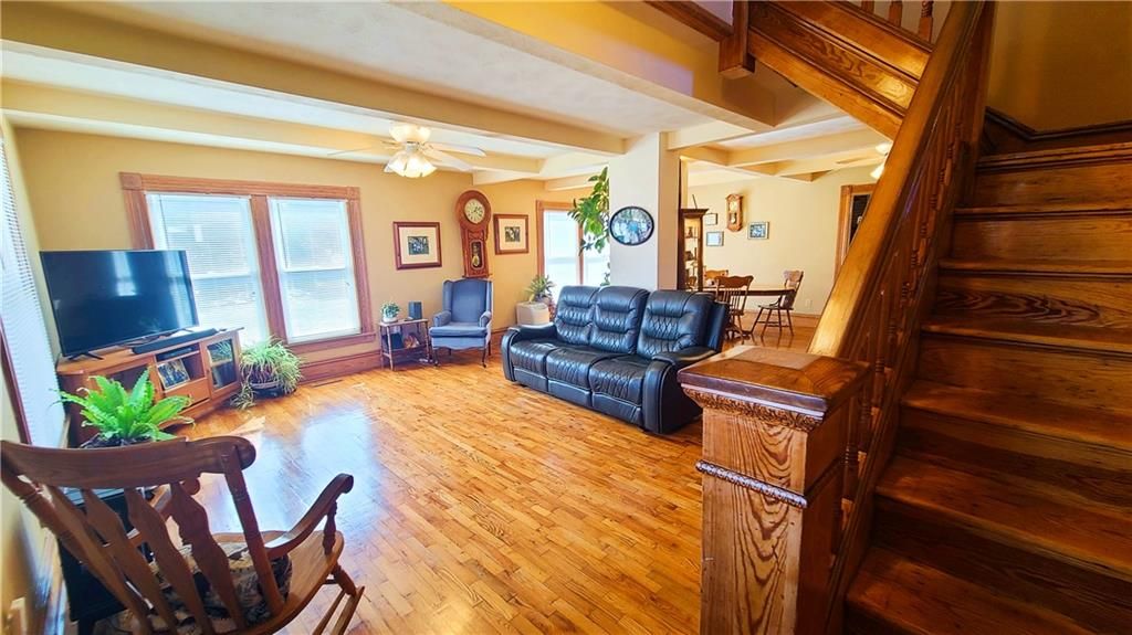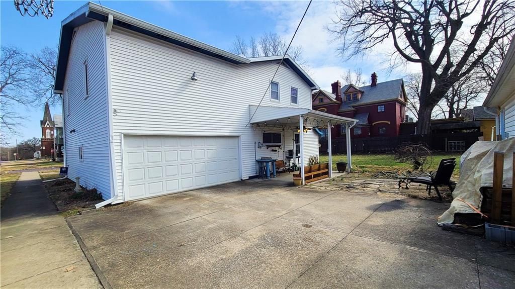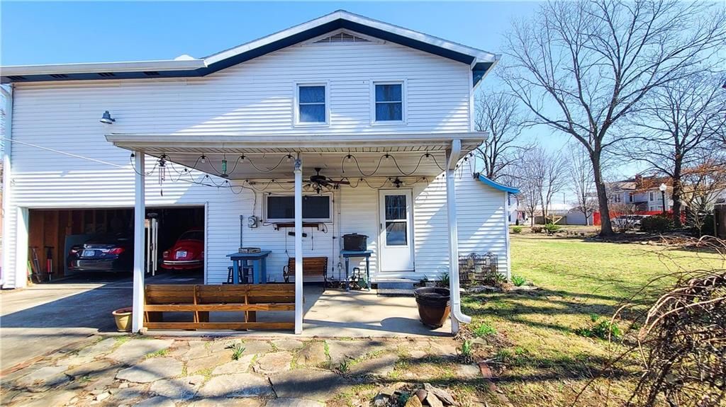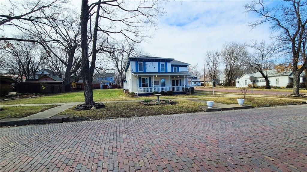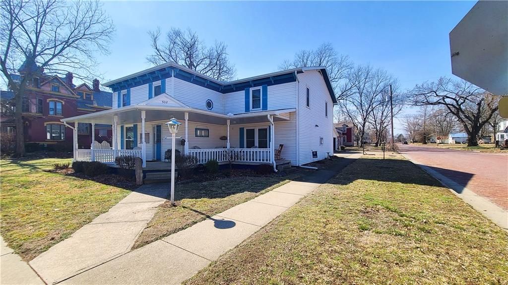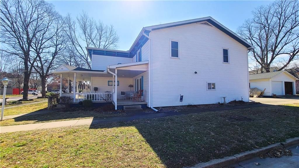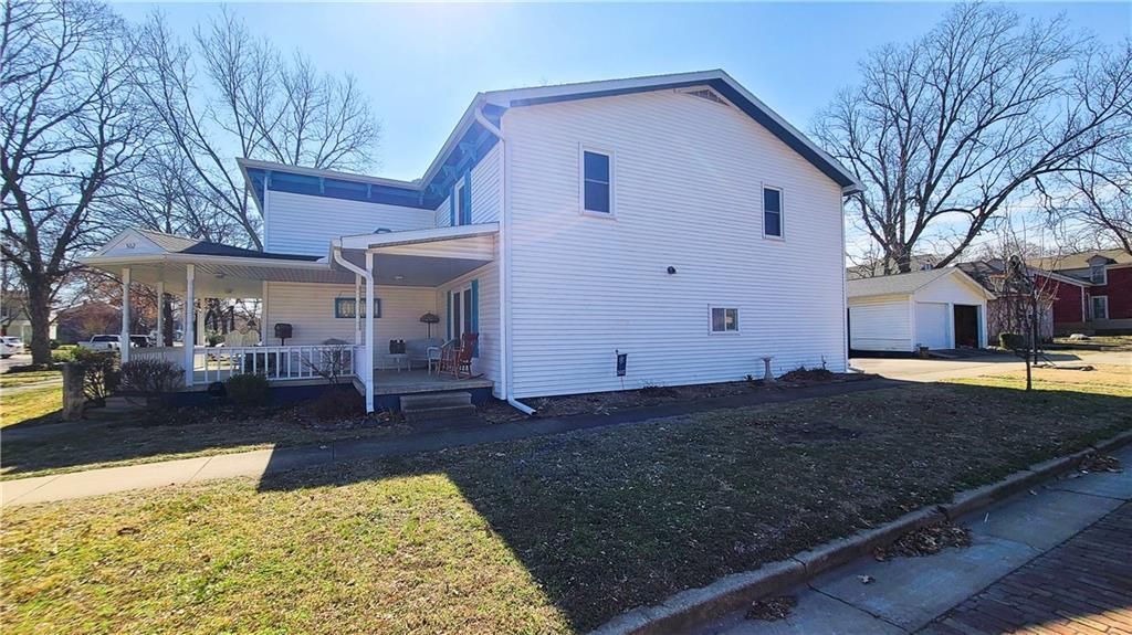 This classic two-story home offers charm and curb appeal galore! Built in 1910, and added onto in 1996, there is a perfect mix of turn-of-the century character and modern updates. Spacious rooms can be found throughout the well-laid out 2,721 square feet. As you approach, you'll be welcomed by the picturesque front porch, complete with a cozy porch swing - the perfect spot to enjoy your morning coffee or unwind after a long day. Step inside, and you'll be greeted by an ornate staircase, the warm ambiance of hardwood floors, and beautiful wood trim through the open concept living and dining space, all highlighted by an abundance of natural light courtesy of the oversized windows. The farmhouse-style kitchen features a perfect blend of functionality and style, and the adjoining mudroom, laundry, and pantry area is convenient and practical. An office is housed on the main floor, and it could easily function as a first-floor bedroom if needed. Additionally, one full bath can be found on each level. Upstairs offers four large bedrooms, as well as a craft room complete with a vintage sink station. Outside, if you are not spending time on the swoon-worth front porch, you can enjoy the covered back patio or open yard space in the adjoining lot to the South, which is included in the sale. With four garage spaces, including a two-car attached and a two-car detached, you'll have plenty of room for your vehicles, storage, or even a workshop. This property has so much to offer the next owner, and its central location ensures easy access to nearby amenities, schools, and entertainment options. Don't miss the opportunity to make this charming and spacious house your own! Welcome home!