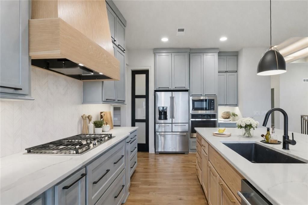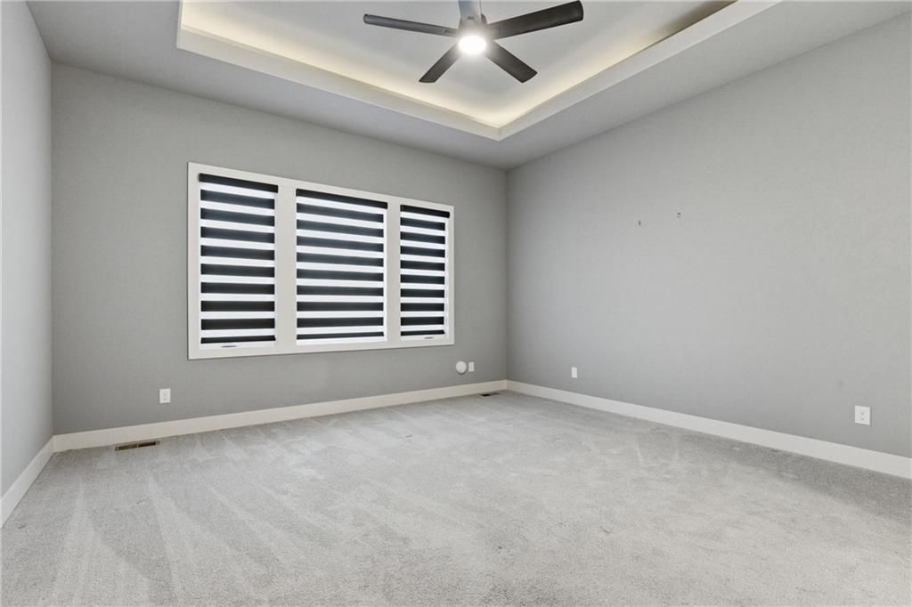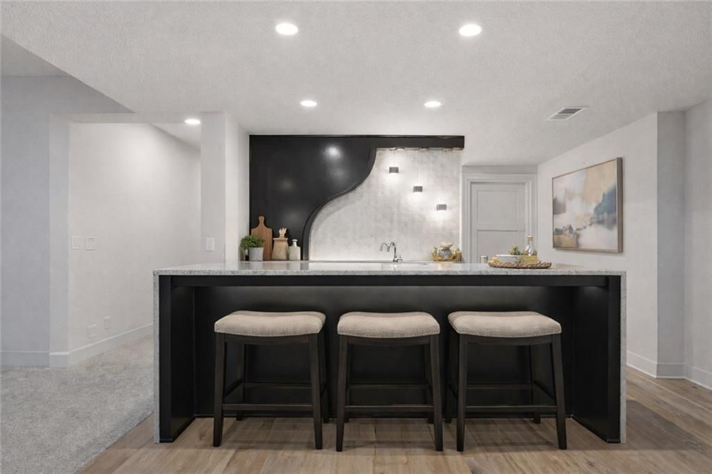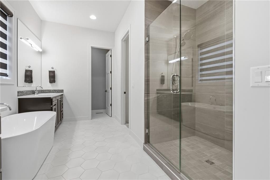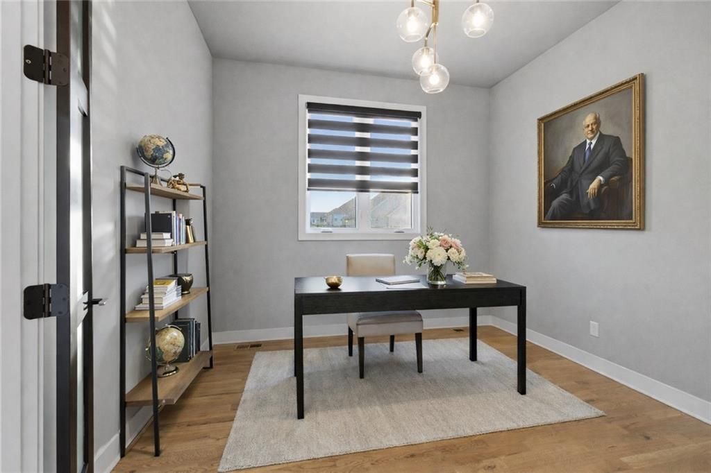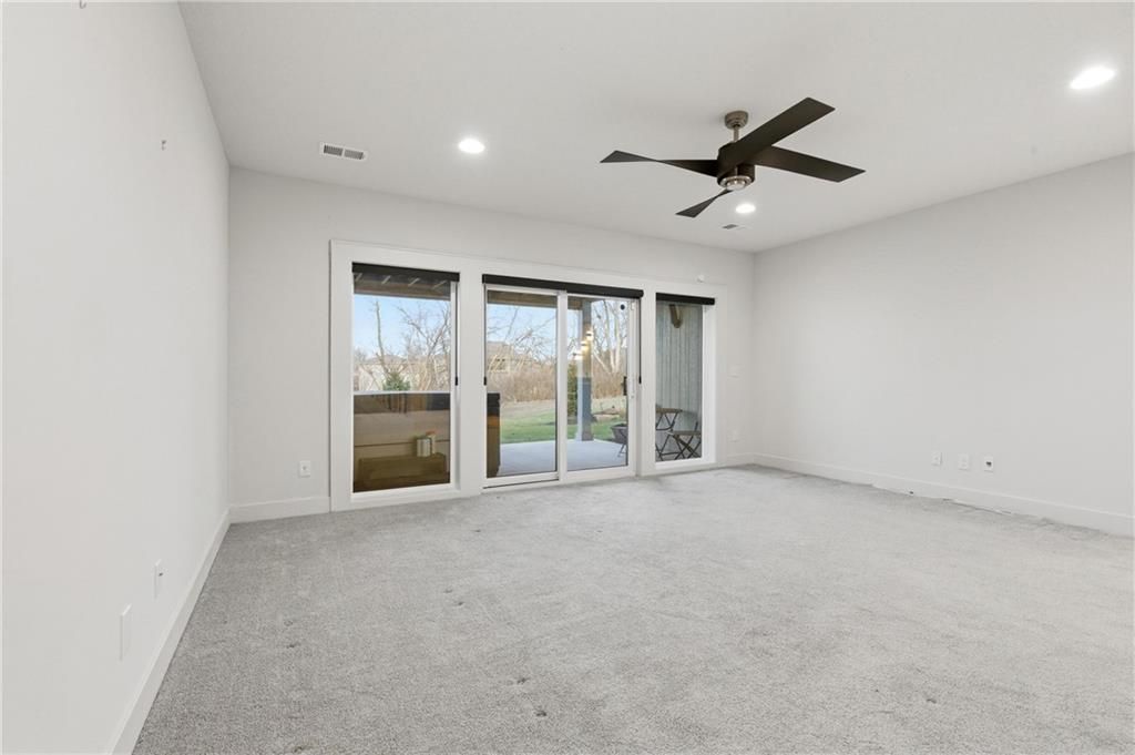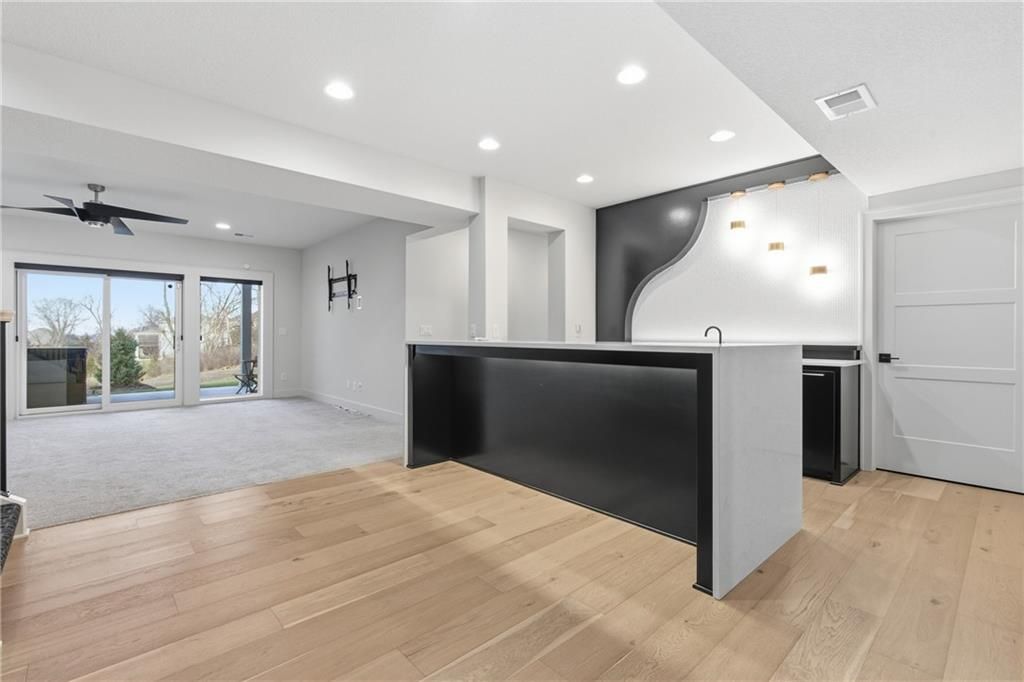 Built in late 2022 by the esteemed Don Julian Builders, this beautifully designed Reverse 1.5 story home is tucked within the premier Bristol Highlands Villas - where maintenance-provided living meets the peace and privacy of rolling hills and protected green space. Just minutes from Shawnee Mission Park, scenic trails and lakes, Lenexa City Center, dining, shopping, De Soto schools, and highway access - yet perfectly secluded - this home truly offers the best of both worlds. Thoughtfully designed for main-level living, the primary suite is a private retreat featuring separate vanities, luxurious soaking tub, walk-in shower with bench, and a spacious walk-in closet with direct access to the laundry room . A stylish powder room for guests and a dedicated office with double doors add both function and flexibility upstairs. The great room features custom built-ins, gas fireplace, and a seamless flow to the covered + screened deck overlooking tranquil green space with privacy! The kitchen - designed for entertaining and everyday living, showcases an oversized island with storage and seating, custom cabinetry to ceiling, quartz, and walk-in pantry. All SS appliances stay, including a newer KitchenAid dishwasher and high-end KitchenAid refrigerator! The walkout lower level is ideal for guests and gatherings, featuring a chic wet bar with beverage fridge, built-in microwave, and island. A cozy family room with slider access to the covered patio is perfect for movie night. One bedroom enjoys easy access to a full hall bath, while 2 additional bedrooms share a Jack-and-Jill bathroom with tub - perfect for hosting family & visitors. Features include high-efficiency HVAC, Lennox smart thermostat, ADT security, automatic privacy screens for the patio and deck, automatic blinds throughout, hardwood floors, and a coveted location backing to community green space. Low-maintenance living. High-end finishes. Don't let this one pass you by - homes like this are truly special.