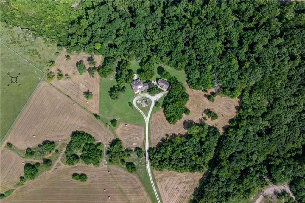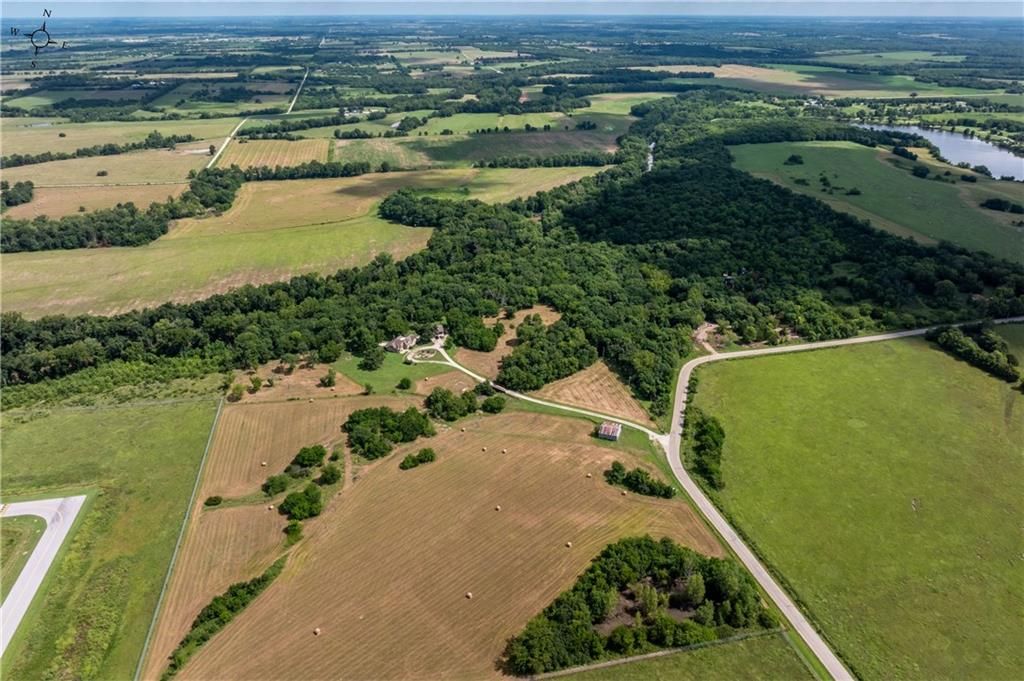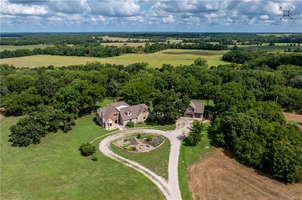 Nestled on a sprawling 31.27 acres, this remarkable property embodies the perfect blend of modern living and natural beauty. Built in 1996 and recently renovated, this 3,316 residence boasts improvements including fresh carpet, paint, fixtures, a newly built office, energy efficient front door, Starlink internet connection, Tesla/EV charging unit and many modernized updates throughout. Entering the property you will pass the 36' x36' building, w/lean-to and drive over the charming iron bridge. You will see the ravine below often flowing with a calming waterfall. Entering the main house you are greeted with a beautiful winding staircase sprawling to the second floor. The tall ceiling entry creates an airy ambiance. The 3 spacious bedrooms, each have walk-in closets, while the well-appointed main suite includes a newly tiled wood-burning fireplace, large bathroom with tiled shower, bidet, and separate entrance to the back patio. The oversized multi-purpose room offers a space to do your workout, play a game of pool or spend hours of fun. The guesthouse offers roughly 800 sq. ft including a full bath, bedroom, office and kitchenette, perfect for visitors above the three-car detached garage. The large space below currently houses a golf simulator and a weight lifting area with plenty of room for storage and car parking. Step outside to find a large stone patio equipped with fireplace/grill perfect for entertaining or enjoying quiet evenings under the stars. Enjoy the pond and the serene flow of the Marmaton River that gracefully winds behind the property. A play set, firepit and zip line promise endless fun for children, and family of all ages. Beautiful Bandera stone can be found on exterior and interior of the home. With the class 4-rated stone-coated steel roof, and new front door, this home combines durability with modern conveniences. This home is not just a residence; it's a lifestyle waiting to be embraced. Don't miss your chance to make it your own!